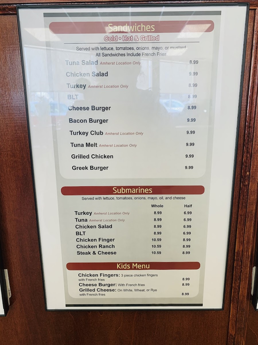 The menu boasts an array of hot and grilled sandwiches, with highlights including the juicy Cheese Burger and flavorful Grilled Chicken sandwiches. Vegetarian options like the renowned Falafel and Tuna Salad cater to diverse taste preferences.